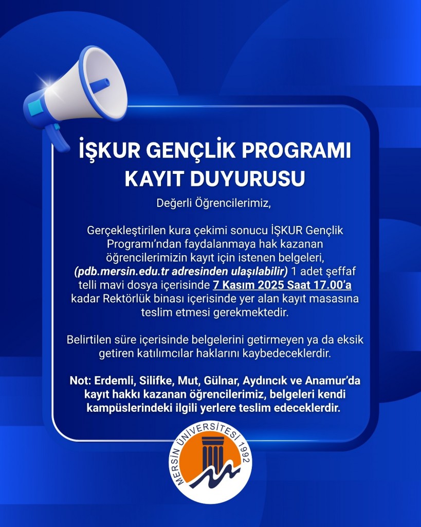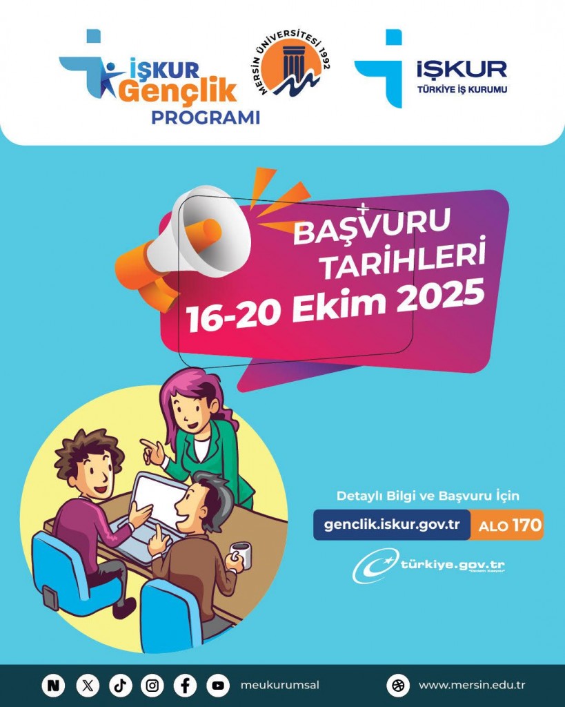 Mersin Çalışma ve İş Kurumu İl Müdürlüğü ile Üniversitemiz işbirliğinde düzenlenecek olan İŞKUR GENÇLİK PROGRAMI için başvurular 16-20 Ekim 2025 (5 Gün) tarihleri arasında https://genclik.is
