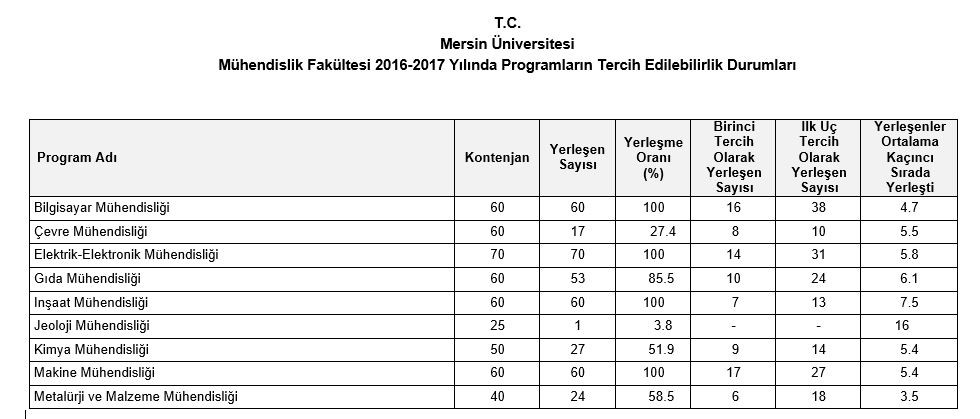 Mersin Üniversitesi Mühendislik Fakültesi 2016-2017 Yılında Programların Tercih Edilebilirlik Durumları