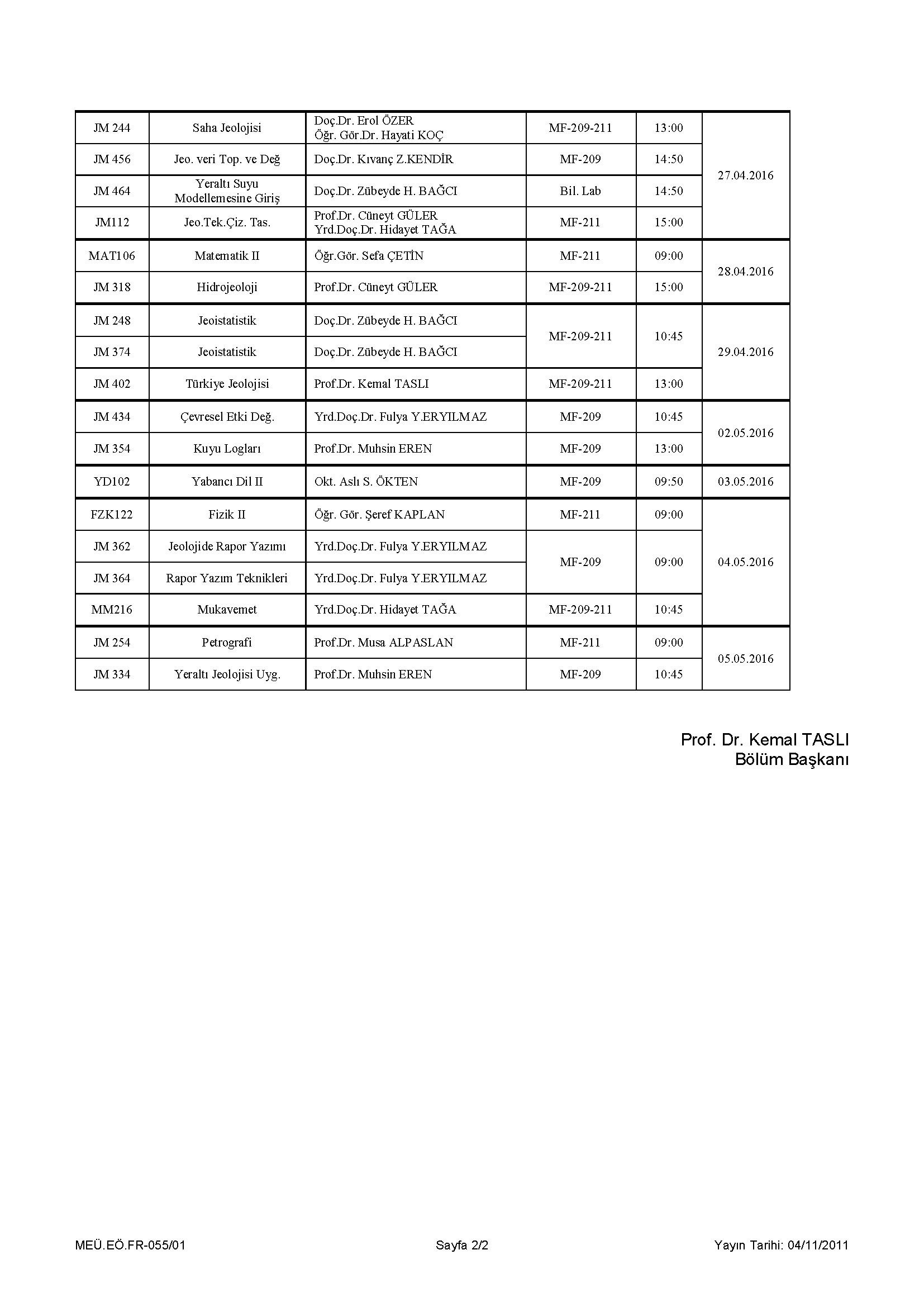 2015 - 2016 Bahar Dönemi Vize Sınav Programı