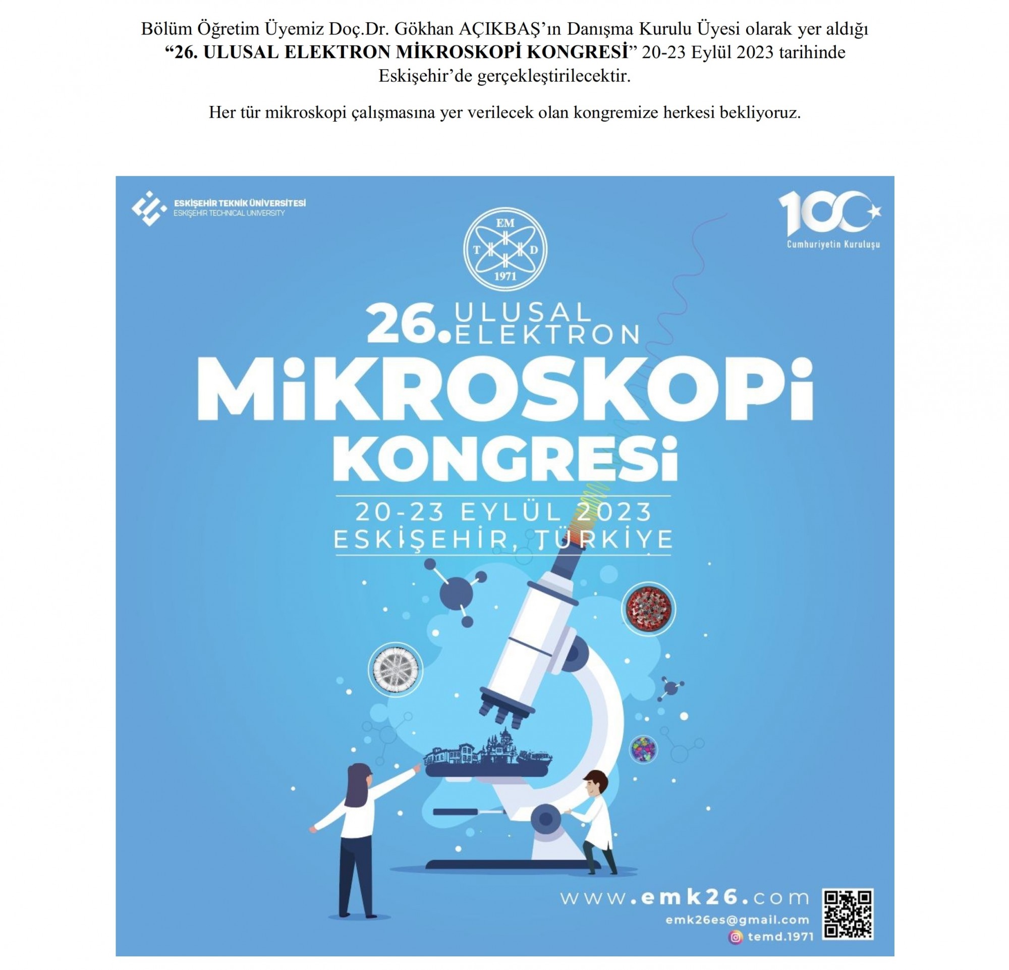 Bölüm Öğretim Üyemiz Doç.Dr. Gökhan AÇIKBAŞ’ın Danışma Kurulu Üyesi olarak yer aldığı “26. ULUSAL ELEKTRON MİKROSKOPİ KONGRESİ” 20-23 Eylül 2023 tarihinde Eskişehir’de gerçekleştirilecektir.