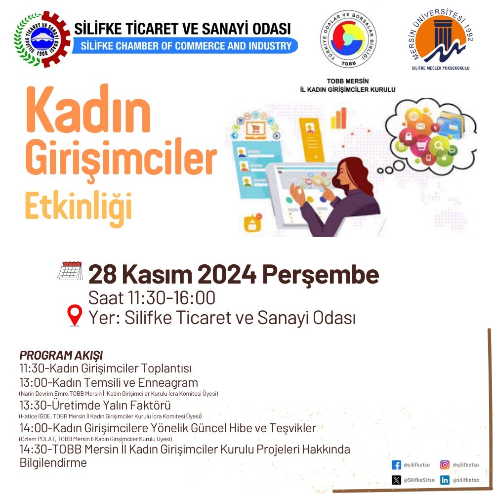 Silifke Ticaret ve Sanayi Odası, TOBB Mersin İl Kadın Girişimciler Kurulu ve Mersin Üniversitesi Silifke MYO iş birliğiyle düzenleyeceğimiz Kadın Girişimciler Etkinliğine siz değerli katılımcılarımızı/paydaşlarımızı dave