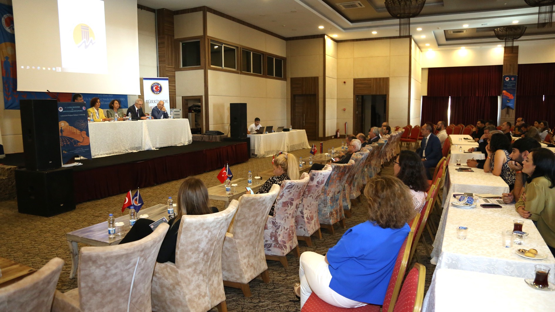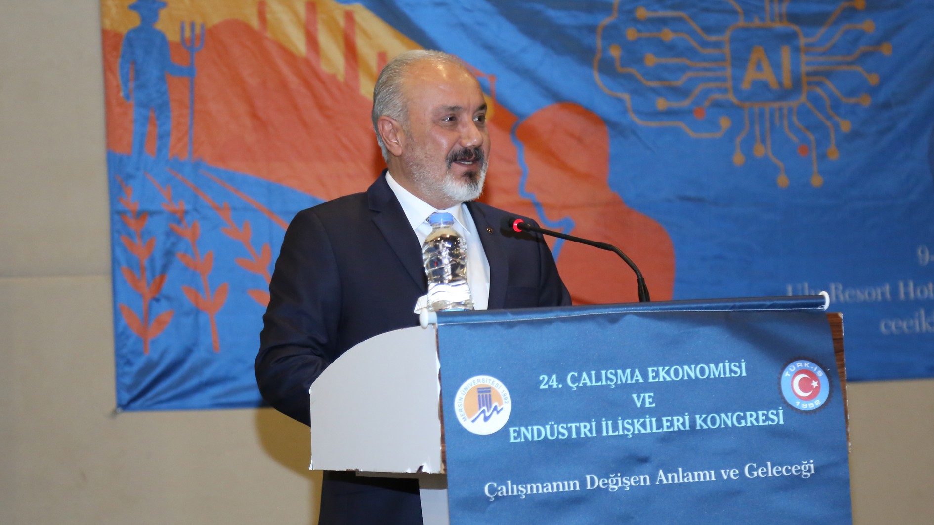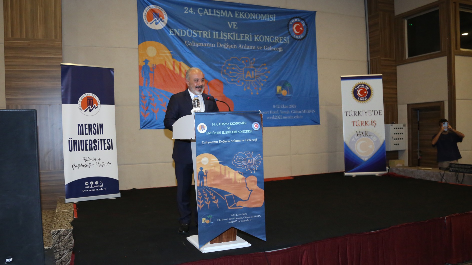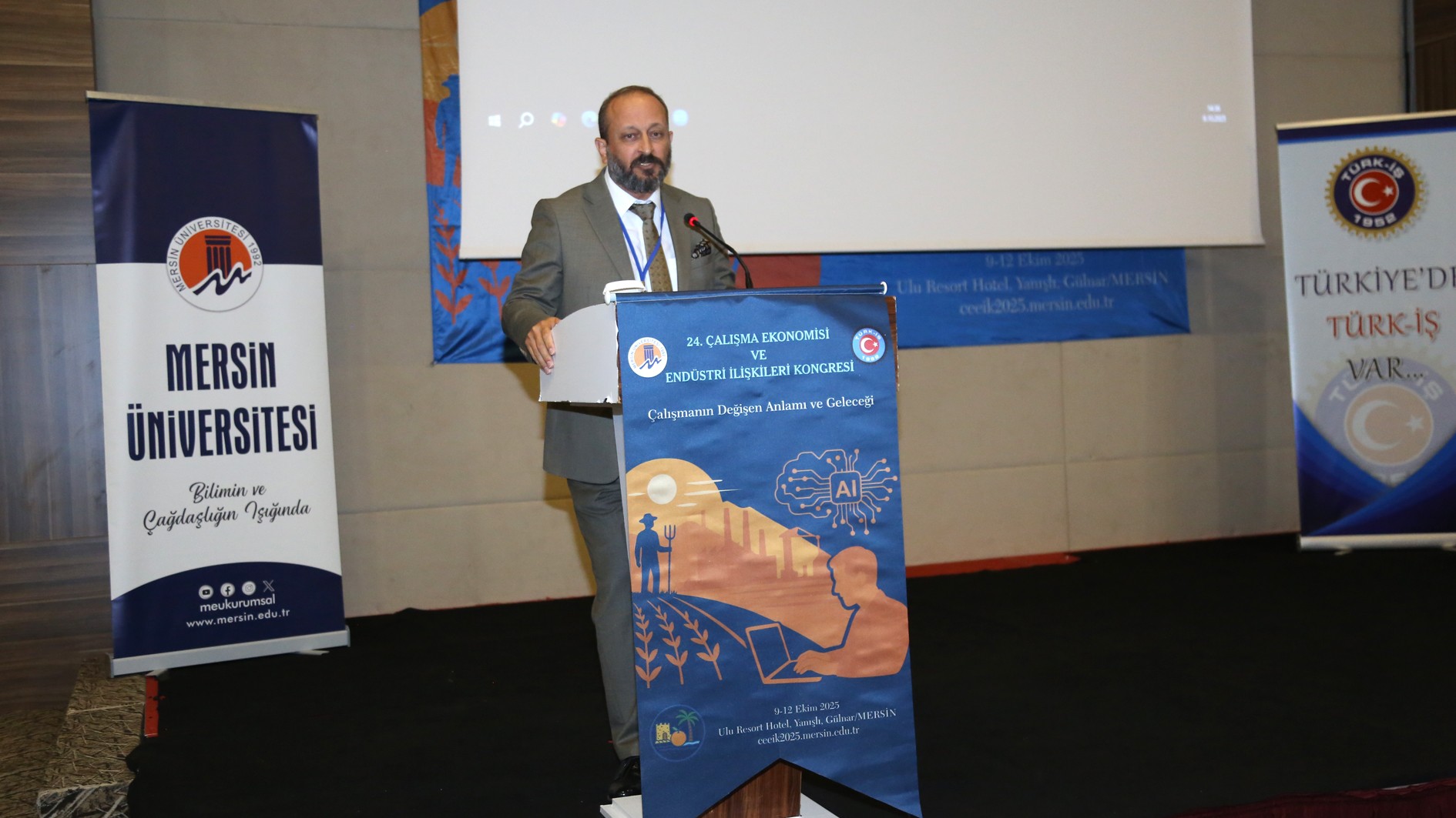 TÜRK-İŞ Konfederasyonu Genel Başkan Yardımcısı İrfan Kabaloğlu konuşmasında “TÜRK-İŞ, bugüne kadar her yıl olduğu gibi, kongremizin düzenlenmesine büyük önem vermiştir. Çalışma Ekonomisi ve Endüstri İlişkileri Kongreleri, yalnızca akademik bir buluşma olmanın ötesinde, işçi sınıfının hakları, çalışma yaşamı ve sosyal adalet gibi kritik konularda önemli tartışmaların yapıldığı platformlardır. Her yıl siz değerli akademisyenlerle bir araya gelmek, birbirimizi dinlemek, sorunlarımızı paylaşmak ve çözüm yolları aramak bizler için çok kıymetlidir. TÜRK-İŞ olarak, kurulduğumuz günden bu yana akademik dünyadan aldığımız destekle, çalışma hayatına dair büyük bir sorumluluk taşıyoruz. Bu kongre, sendikacılıkla ilgili yaklaşımlarımızı geliştirmeye ve işçi hakları konusundaki bilgimizi derinleştirmeye olan katkıları dolayısıyla oldukça önemlidir. Bugün burada, yalnızca çalışma hayatının değişen dinamiklerini değil, bu değişimin işçi sınıfı ve toplum üzerindeki etkilerini de tartışmak için toplandık.” ifadelerine yer verdi.