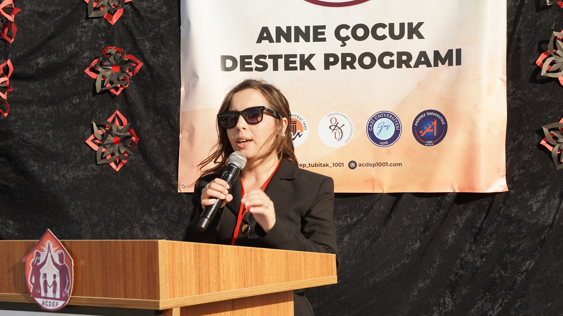Açış konuşmasını yapan proje yürütücüsü Doç. Dr. Feyza Uçar Çabuk, AÇDEP’in amacına ilişkin, “Projemiz kapsamında geliştirilen Anne Çocuk Destek Programı, 6 Şubat depremini yaşamış annelerin çocuklarıyla ilişkilerini güçlendirmeyi, annelerin ve çocukların kaygı seviyelerini azaltmayı, ebeveyn öz yeterliğini ve çocukların duygu düzenleme becerilerini desteklemeyi amaçlamaktadır. Bu doğrultuda, geçtiğimiz yıl Osmaniye’de konteyner kentte yaşayan okul öncesi dönem çocuğu olan annelerle görüşmeler yaparak eğitim ihtiyaçlarını belirledik. Uzman kadromuzla birlikte bu ihtiyaçlara yönelik hem annelere özel oturumları hem de annelerin çocuklarıyla birlikte evde yapabilecekleri etkinlikleri içeren AÇDEP’i hazırladık. Program kapsamında her oturum için annelere dağıtılacak kitaplar da belirlendi.” ifadelerini kullandı.