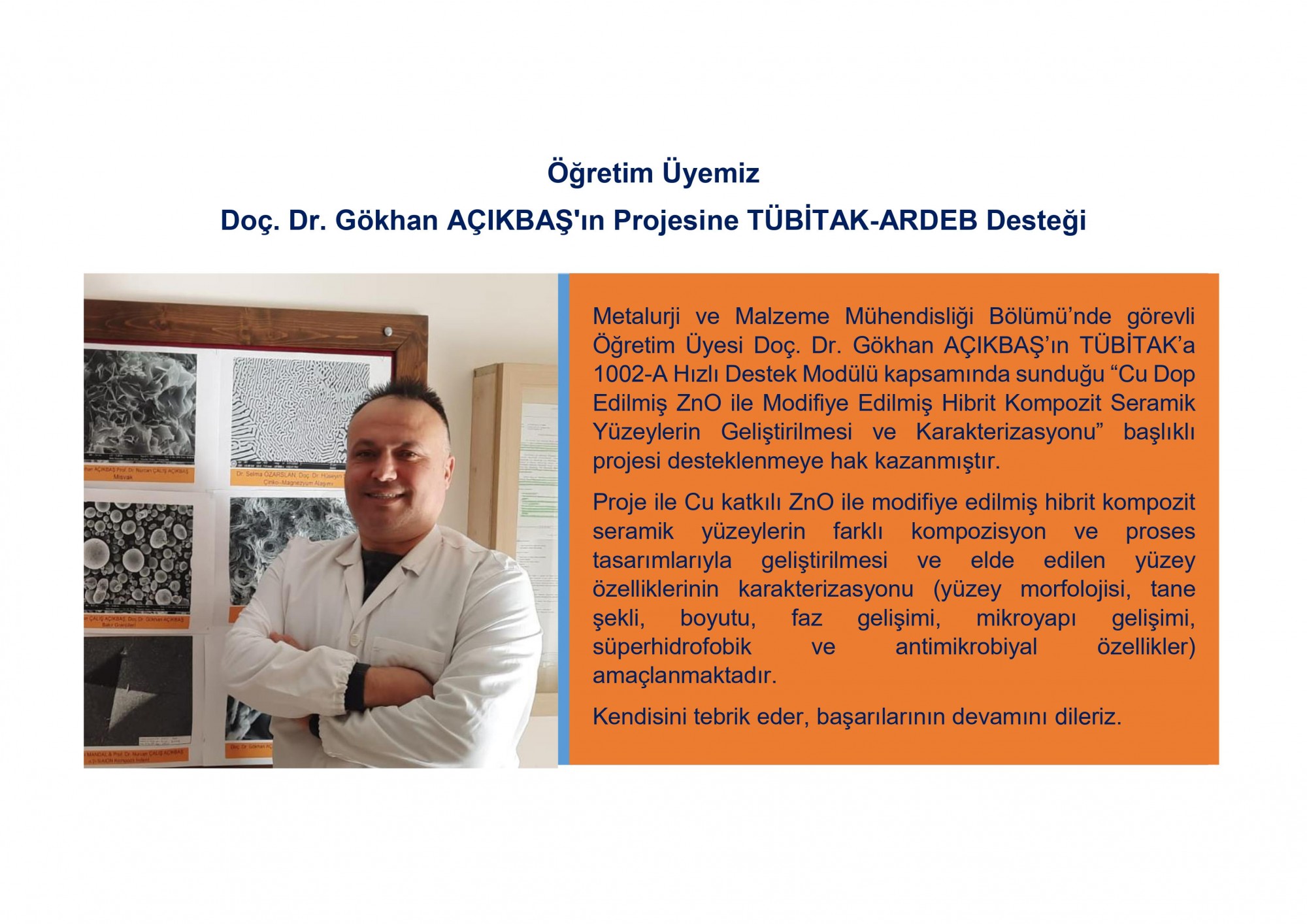 Metalurji ve Malzeme Mühendisliği Bölümü öğretim üyemiz Doç. Dr. Gökhan Açıkbaş’ın TÜBİTAK’a 1002-A Hızlı Destek Modülü kapsamında sunduğu “Cu Dop Edilmiş ZnO ile Modifiye Edilmiş Hibrit Kom