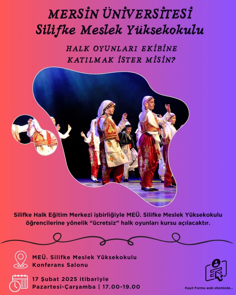 Meslek Yüksekokulumuzla Silifke Halk Eğitim Müdürlüğü işbirliğinde öğrencilerimize yönelik Halk Oyunları kursu açılacaktır. 17.02.2025 tarihinde başlayacak olan kursa aşağıdaki başvuru linkinden ulaş